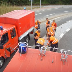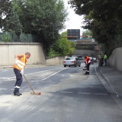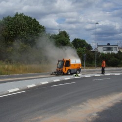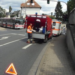 Für die Feuerwehrmänner begann der Einsatz zu dieser Zeit erst richtig. Während sie die Dieselspur auf der Kreuzung Friedrich-Ebert-Straße Hafenstraße kehrten, berichteten zahlreiche Autofahrer von weiteren Lachen im Bereich der neuen B9-Auffahrt und in der Gegenrichtung bis zum Bahnhof. Zuviel für die Wehrmänner alleine. Kurz entschlossen alarmierte der Einsatzleiter den Bauhof der Stadt mit der Kehrmaschine hinzu. Durch die guten Beziehungen und die hervorragende Zusammenarbeit in der Vergangenheit, fand sich sogar an diesem Dienstfreien Sonntag ein Fahrer für die Kehrmaschine. Ohne die Männer des Bauhofs wären die immer zahlreicher werdenden, großen Ölspuren für die Feuerwehr überhaupt nicht mehr abzuarbeiten.