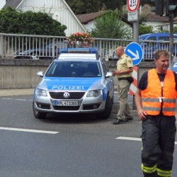 Zur einer Ölspur wurde die Tag-Schleife der Oppenheimer Wehr an diesem Sonntagmittag alarmiert. Als die Kräfte an der Einsatzstelle mit dem MTW/P ankamen, trafen sie dort auf den DRK-RTW aus Nierstein und einen Streifenwagen der PI-Oppenheim. Der Rettungswagen war zu einem Verkehrsunfall mit Personenschaden alarmiert worden. Vorort stellte sich jedoch heraus, dass der gestürzte Rollerfahrer keine gravierenden Verletzungen davon getragen hatte. Diese Tatsache konnte der Mann aber nur seinem Fahrerischen Können zuschreiben, denn die Dieselspur auf der er ausgerutscht war, konnte nur schlecht als solche erkannt werden, da sie genau im Schatten einiger Bäume lag. Durch seine gekonnte Reaktion verhinderte der Fahrer auch insofern Schlimmeres, da er dem bereits kaum zu kontrollierend gewordenen Fahrzeug, beim fallen noch die richtige Richtung gab, sonst wäre er mit Sicherheit in den Gegenverkehr gestürzt. So musste er nur eine kleinere Wunde verbunden bekommen kriegen.