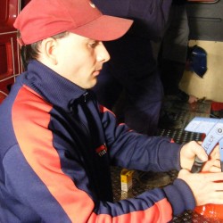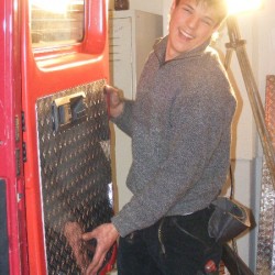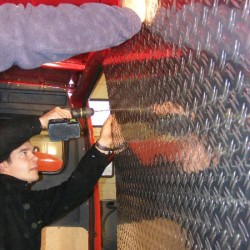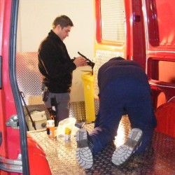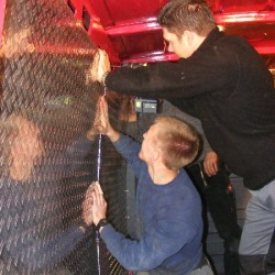 An diesem Freitag trafen sich sechs Feuerwehrleute um die Riffelblechplatten endlich einzubauen. Zuvor musste noch eine weitere Schweißnaht ausgebessert werden. Diese Arbeit übernahm Michael. Dennis, Daniel und unser Projektleiter Michael bereiteten die Wände und den Boden für die Installation der Bleche vor. Hierzu wurden Moosgummibänder auf die Auflageflächen der Bleche geklebt. Auf die Außenwände klebten die Kameraden Bitumenbänder, diese sollen später den Hall in den Hohlräumen unter den Blechen verhindern.