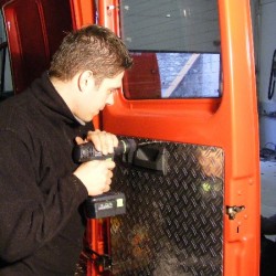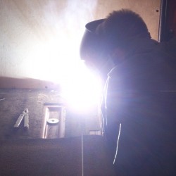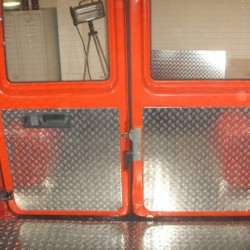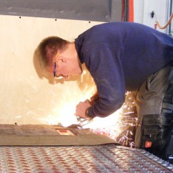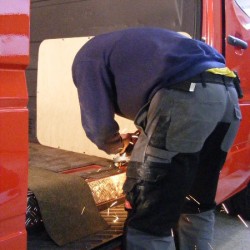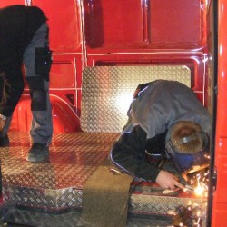 Anschließend begannen die Männer damit, noch während die Schweißnähte gefertigt wurden, die Bodenbleche einzubauen. Bis die Schweißarbeiten beendet waren, bauten die drei Hobbymechaniker die Tafeln an die Hecktüren.