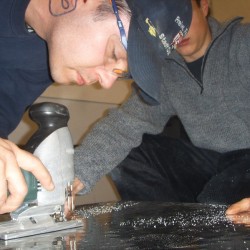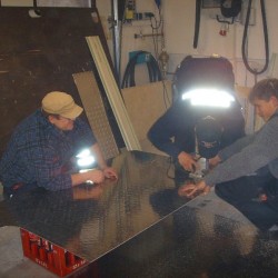 Anschließend, als alle vorbereitenden Arbeiten erledigt waren, folgte die größte Arbeit des Tages, das entgültige Verkleiden der Stufe. Da die Kameraden es ganz besonders ordentlich machen wollten, machten sie sich die Arbeit auf jede Fläche die sich bot ein Blech anzupassen. Egal wie viele Kanten, Ecken oder Pfalzen im Weg waren.