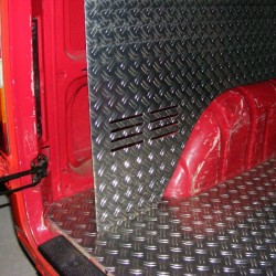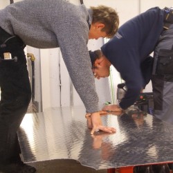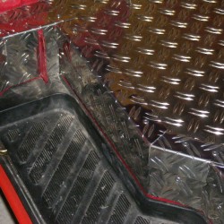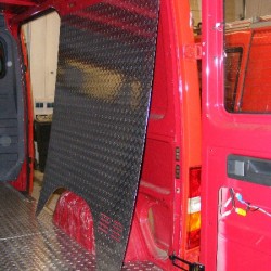 Als die Bodenbleche zum ersten Mal in dem Laderaum des Sprinters lagen, bemerkten die Arbeiter ein Problem. Die Trittstufe, zur Seitentür des Heckraums, war an einer Kante abgeschrägt. Diese Form stellt eine große Schwierigkeit da, wenn man sie verkleiden will. Eine Lösung wurde gesucht. Schließlich entschloss man sich die Bleche nicht einfach über die Stufe zu börteln. Das wäre auf Grund der Rundung einfach nicht möglich gewesen, wenn man eine durchgängige Oberfläche haben wollte, die keinerlei Stolperfallen aufweisen sollte. Die optisch- und technischbeste Lösung war eine Kanteverkleidung aus verschiedenen Blechen zusammenzubauen. Während zwei Kameraden ein schmales Blech auf die Vorderseite der Stufe anpassten, fuhr Daniel zu seiner Arbeitsstelle und formte dort eine Winkelleiste, aus einem weiteren Stück Riffelblech. Diese Leiste schnitt er dann Vorort, um sie hundertprozentig auf die Form der Trittstufe anpassen zu können. zu.