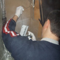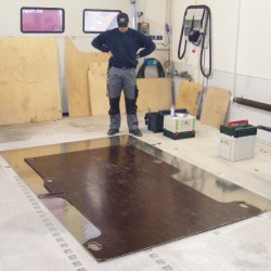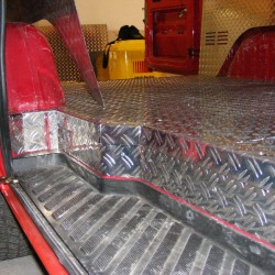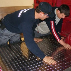 Am Donnerstag zuvor waren die großen Riffelblechplatten beim Hersteller in Mainz abgeholt worden. Mit ihnen sollten alle Holzverkleidungen sowie der Holzboden selbst, im Geräteraum, ersetzt werden. Aus diesem Grund hatten die Kameraden die Verkleidungen vorsichtig ausgebaut und aufgehoben. An diesem Morgen nutzen die Feuerwehrleute diese Sperrholzplatten als Schablonen. Auf die Rückseite des Blechs gelegt, zeichnete Dennis die Konturen nach. An diesen Linien sägte er anschließend, mit der Handkreissäge oder einer Stichsäge, entlang. Anfangs unterstützte Uli diese Arbeit noch, in dem er half die große Blechscheibe festzuhalten, dann übernahm er aber die Lackierung der Metalltrittstufen aus der Stoßstange. Hierzu musste er eine Behelfslackierkabine bauen. Die beiden anderen Wehrleute halfen weiter beim Zuschneiden.