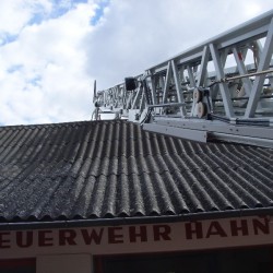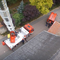 Bei der Fahrzeugausstellung war die Drehleiter von Oppenheim natürlich mit eingebunden. Sie sollte auch noch den letzten Teilnehmer zu der, in einer Sackgasse gelegenen, Feuerwache führen. Einfach nur ausfahren und abstellen wäre aber verschwendete Liebesmüh' gewesen, also nutzen die Hahnheimer Kameraden auch noch einmal die Möglichkeit sich ihr schönes Dorf von oben anzusehen und eine kurze Einweisung in die Fahrzeugtechnik zu bekommen.
