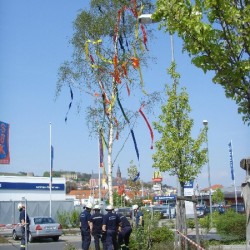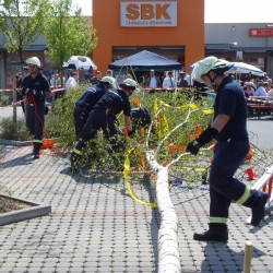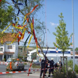 Da war es klar, dass in diesem Jahr nicht nur die Aktiven beim Stellen des Maibaums auf dem Plan standen. Die Jugendlichen präsentierten sich schon am Vormittag mit einer Schauübung. Hier zeigten sie ihr ganzes Können und sämtliche Ausrüstung die sie von den vorgefahrenen Fahrzeugen ( TLF, TSF und DLK ) zusammentragen konnten. Gleichzeitig verkauften die Männer des Küchenzugs heiße Würstchen. Auch diese Einnahmen gingen in die Tasche der Jugendfeuerwehr. Aber auch die Aktiven konnten sich am Nachmittag über ein Geschenk freuen. Der SBK-Markt sonderte eine Biertischgarnitur und einen Schwenkgrill aus. Das ehemalige Werbeinventar wurde noch nie genutzt und so bekamen die Männer ein nagelneues Set. Natürlich stellten die Männer auch noch den Maibaum.
