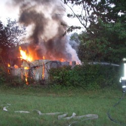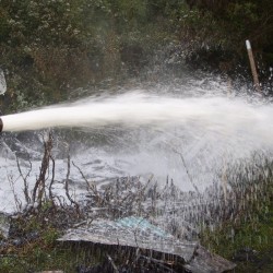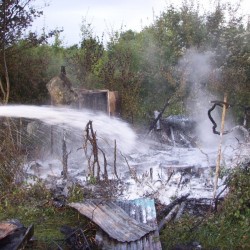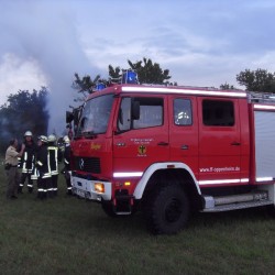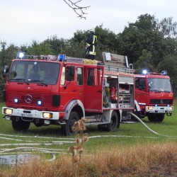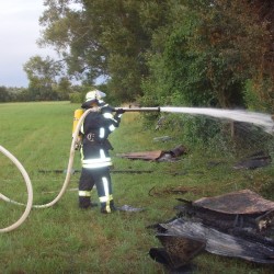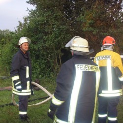Das zusammengebrochene Gartenhaus bildete eine so dicke Schicht Brandgut, dass die 2500Liter Wasser des Tanklöschfahrzeugs für das entgültige Ablöschen nicht ausreichte und so mussten die knappen 800Liter Löschwasser des LF8/6 auch noch in das Tanklöschfahrzeug eingespeist werden.