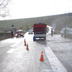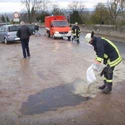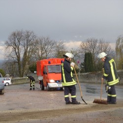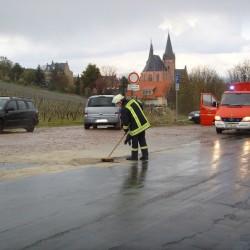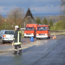 Eine Schraube der Ölwanne eines Minivans, hatte sich offenbar von den Vibrationen des Wagens selbst gelöst. Der Fahrer bemerkte die Situation sofort, steuerte auf einen Parkplatz und verständigte die Feuerwehr. Die Wehrmänner die mit dem MTW und später dem ELW anrückten, waren durch die frühe Alarmierung, im Stande die Ausbreitung auf die stark befahrene Kreisstraße zu verhindern. Nachdem die E-Stelle abgesichert und die Polizei die Absicherungsmaßnahmen abgenommen hatte, konnten die Wehrmänner wieder einrücken.