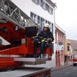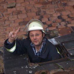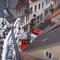 Der Stellvertretende Wehrführer war mit dem Altstadtlöschfahrzeug als erstes vor Ort und übernahm die Einsatzleitung. Er dirigierte die Drehleiter und das TLF in die Krämerstraße. Dort besetzte der Angriffstrupp 23 den Korb der positionierte Drehleiter. Mit der Wärmebildkamera ausgerüstet fuhren die beiden den Kamin, der auf der Dachseite des Innenhofs lag, an und kontrollierten seine Temperatur. Während beim Eintreffen des Oppenheim 95/2 noch Flammen und Funken aus dem Kaminschlund drangen, konnte der Angriffstrupp nur noch eine geringe Wärme von knappen 70°C feststellen. Fünf weitere Kräfte kontrollierten zeitgleich die Räumklappen des Kamins. Aber auch hier konnte nur ein sehr verkrusteter, glühender Kamin festgestellt werden. Also wurde der Angriffstrupp angewiesen den Schornstein durchzukehren. Beim kehren gab der obere Kaminabschluss seinen Geist komplett auf und brach von seinem Lager. Bei der genaueren Kontrolle der Überreste stellten die Feuerwehrleute fest, dass der Abschluss schon komplett durchgebrannt war. Ob diese Tatsache von dem kurz zuvor geschehenen Kaminbrand herrührte oder schon im Vorfeld geschehen war, konnte vor Ort nicht festgestellt werden.