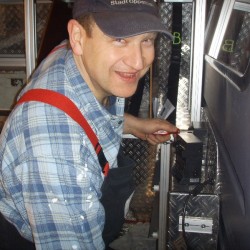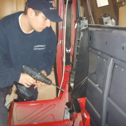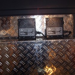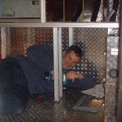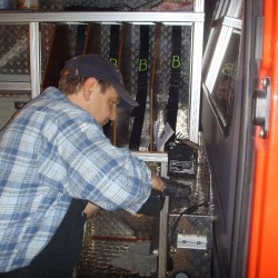 Vor diesem Ergebnis standen auch die fünf Kameraden, die sich and diesem Samstag im Spatzennest getroffen hatten, um den Ausbau zu einem möglichst schnellen Ende zu bringen. Die enthusiastische Welle war dann aber auch schnell wieder abgeebbt, als sie die vielen kleinen Baustellen entdeckten. Also, um den Mut nicht zu verlieren, suchten sich die Kameraden zwei Baustellen aus und begannen damit die Beine des mittleren Regals am Boden zu befestigen. Diese Aufgabe ist wieder einmal nur eine Vorarbeit, denn anschließend können erst die Regalschienen für die Tragekästen eingepasst werden. Da diese aber auch noch in der Fertigung sind, war die nächste kleine Baustelle, das anbringen und verkabeln zweier Handscheinwerferladegeräte. Diese klitzekleine Baustelle, nahm dann auch schnell den restlichen Tag in Anspruch. Da die Zuleitungen durch das Fahrerhaus verlegt werden mussten und die Kabel dann zwischen den Halterungen so rauskommen mussten, dass die Steckverbindungen auch noch passen, dauerte diese Arbeit extrem lange. Aber auch dieses Problem wurde gelöst und der Ausbau kam wieder ein bisschen weiter voran.