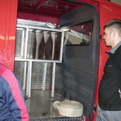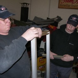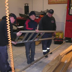 Weiter bauten die Männer das erste Teilregal für den mittleren Geräteraum zusammen und hoben dieses in den Sprinter. Anschließend wurde das zweite Teil des mittleren Regals zusammen geschraubt und auf das erste gesetzt. Mit den passenden Trennwänden aus einem gebrauchten Holzregal, entstand so das erste fertige Teilstück des mittleren Regals: das Schlauchfach! In diesem Fach sollen später vier B-Schläuche untergebracht werden, welche für die großen Tauchpumpen benötigt werden.