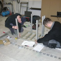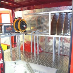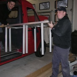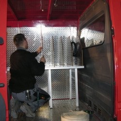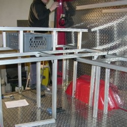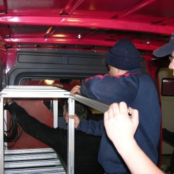 Diese Arbeiten, das zuschneiden, zusammenschrauben und einbauen, nahmen fast den ganzen Tag in Anspruch. Viel Zeit benötigte auch die Herstellung der passenden zusätzlichen Winkelhalter für das Regal im heckseitigen Geräteraum.