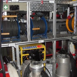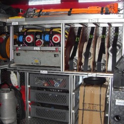 In den letzten Tage wurden wieder einige Arbeiten an dem neuen Gerätewagen erledigt. Unter anderem bekam das neue Notstromaggregat endlich eine Ladeerhaltung. Diese musste, wie eigentlich alles, genau in den Wagen eingepasst werden. Also baute Kurt nicht nur eine Halterung für das Kfz-Ladegerät, er baute auch die passende Halterung für den Ladestecker am Aggregat selbst. Außerdem wurden die Gurte für die Lagerung der großen Stative und der großen Verteiler gefertigt. Kurt und Michael hatten sich unter der Woche im Spatzennest getroffen und die Befestigungen der Gurte zusammen ausgeheckt. Nachdem die Bänderungen, nach einer zerstörten Nähmaschine per Hand endlich fertiggenäht waren, baute Michael sie gleich an das Regal an.
