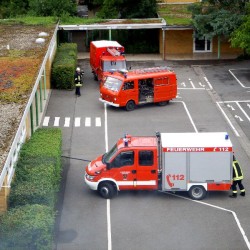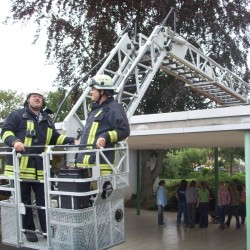 Bei dieser Räumungsübung traten aber auch wieder einige kleinere Probleme und Behinderungen auf. Die Zufahrt zum Schulgelände hatte der Drehleitermaschinist schon während der Übung freischneiden müssen. Einige größere Äste hatten sich bis in die Fahrspur ausgebreitet. Obendrein hatte auch noch ein Hinweisschild im Schwenkbereich des Leiterparks gestanden. Diese Einsatzbehinderungen der Leiter wurden im nachhinein noch einmal mit den Verantwortlichen der Hahnheimer Wehr besprochen. Außerdem wurde noch einmal die zweite Feuerwehrzufahrt in Augenschein genommen und Verbesserungsvorschläge zusammengetragen, wie die sehr schmale Zufahrt auch für Großfahrzeuge nutzbar gemacht werden könnte. Anschließend wurde ein noch besserer und vor allem näherer Standplatz für die Drehleiter ausgetestet, der in naher Zukunft dann auch farbig auf dem Asphalt gekennzeichnet werden soll.