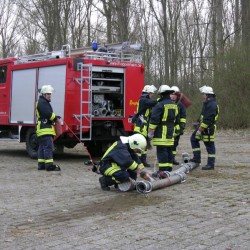 Die Gruppe die im kommenden Mai an der Abnahme zur bronzenen Leistungsspange teilnehmen wird, übte vom Löschgruppenfahrzeug aus den Brandangriff nach FwDV3.