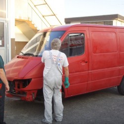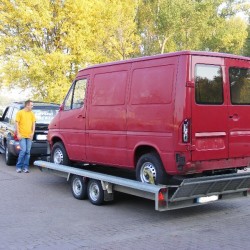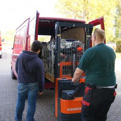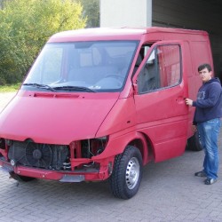 Da die Vorarbeiten, welche in der Hauptfeuerwache durchgeführt werden konnten, soweit erledigt waren, musste der Wagen an diesem Abend für den Transport in die Lackiererei vorbereitet werden. Sämtliche Geräte des alten Gerätewagen-Licht, die in zwei Europalletten und teilweise auch lose auf der Ladefläche untergebracht waren, mussten abgeladen werden. Ein Kamerad hatte sich vom befreundeten Autohaus Leineweber eine Zugmaschine, sowie einen Fahrzeugtransportanhänger ausgeliehen. Der leere Sprinter wurde dann mit einem Fahrer und drei Einweisern, die Rückspiegel und alle anderen Anbauten waren schon eine Woche zuvor von einem unsrer angehenden KFZ-Meistern abgebaut worden, auf den Hänger bucksiert und verzurrt.