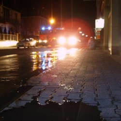 Vor Ort hatte sich ein kleiner Fluss vor dem ehemaligen Supermarkt gebildet. Die Wassermassen nahmen ihren Ursprung unter einem gepflasterten Gehweg. Hier war ein großes Trinkwasserrohr gebrochen. Das hier austretende Wassersandgemisch hatte sogar so eine große Kraft, dass es einen Metallpfosten umbiegen und das an Ihm befestigte Tor aus dem Schloss sprengen konnte. Von hieraus und durch ein Schutzrohr drang Wasser in den Keller des angrenzenden Gebäudes. Mit einem Wassersauger nahm eine Kraft das sandige Wasser auf. Kurz zuvor war ein Mitarbeiter der Wasserversorgung eingetroffen, Der das Wasser des Straßenzuges abstellte. Als der Strom abebbte wurde das gesamte Ausmaß des Schadens sichtbar. Der Gehweg hatte sich knappe zehn Zentimeter gehoben. Der starke Druck des Wassers spülte eine zehn Zentimeter dicke und eine zehn auf fünf Meter große Schleichdecke auf die Straße. Um eine Durchfahrt mit Fahrzeugen zu ermöglichen befreiten die Männer eine Straßenseite vom Schmutz. Hierbei machte sich die neu installierte Umfeldbeleuchtung des Mannschaftstransporters bezahlt, mit Der die Straße ausgeleuchtet werden konnte. Der Rest des Einsatzes beschränkte sich auf das Warten auf die, von der Wasserversorgung beauftragte, Straßenbaufirma.