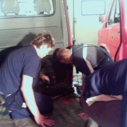 An diesem Sonntagmorgen trafen sich einige Kameraden um den Geräteraum für den Ausbau weiter vorzubereiten. Die Riffelbleche, welche am Samstag zugeschnitten worden waren, können solange nicht eingebaut werden, bis der Innenraum selbst noch einmal lackiert wurde.