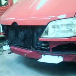 Um aber trotzdem noch ein Stück weiterzukommen, bauten die Arbeiter, die frischlackierten und getrockneten Trittstufen, wieder an die Fahrzeugfront.