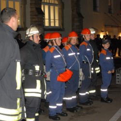 An diesem Samstagabend empfingen die Kameraden der Oppenheimer Feuerwehr, die Abordnungen der Feuerwehr Unna-Mitte, der Feuerwehr Neustadt-Titisee und der Feuerwehr Härtlingen den ehemaligen Wehrführer Kurt Zöller mit Gemahlin, an der frisch renovierten Emondhalle.